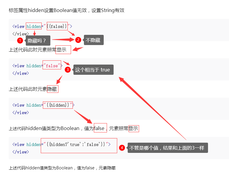 开发中遇到需要频繁显示隐藏组件,wx:if不太适合,翻开发者文档看到hidden属性,下面是文档描述