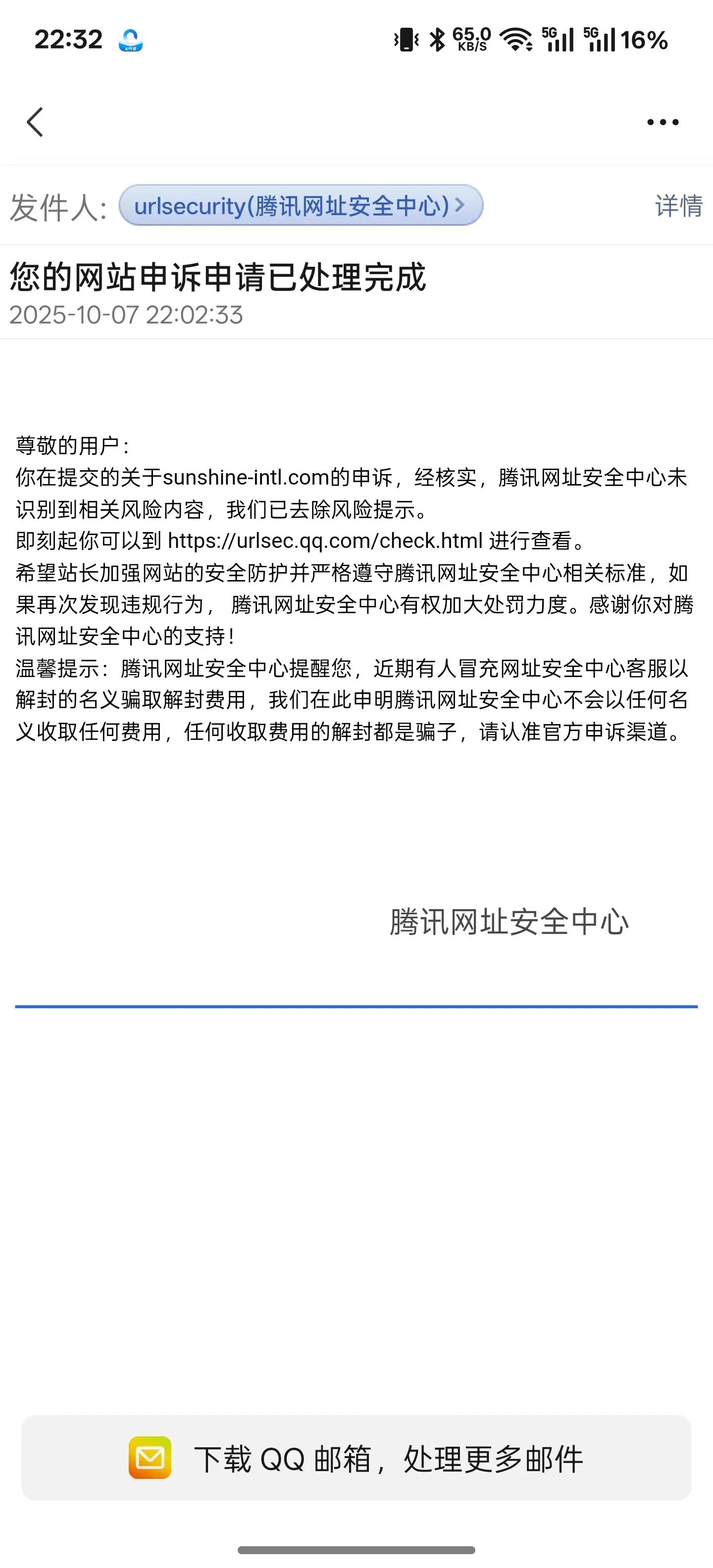 你好,经审核,域名【sunshine-intl.com】下的内容存在违反《微信外部链接内容管理规范》,暂无法恢复微信内直接访问的服务。
