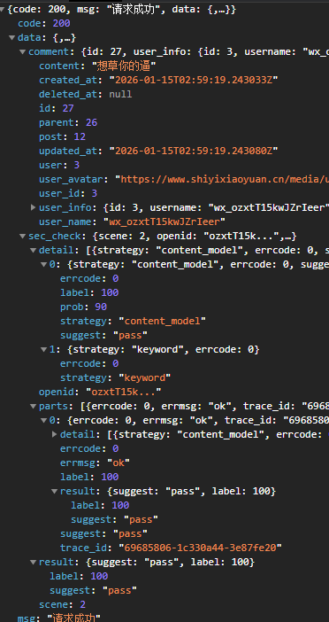 文本内容安全识别的接口,现在对于我发布的评论自己通过了,导致我现在小程序审核过不了,一直卡着你给我解决一下