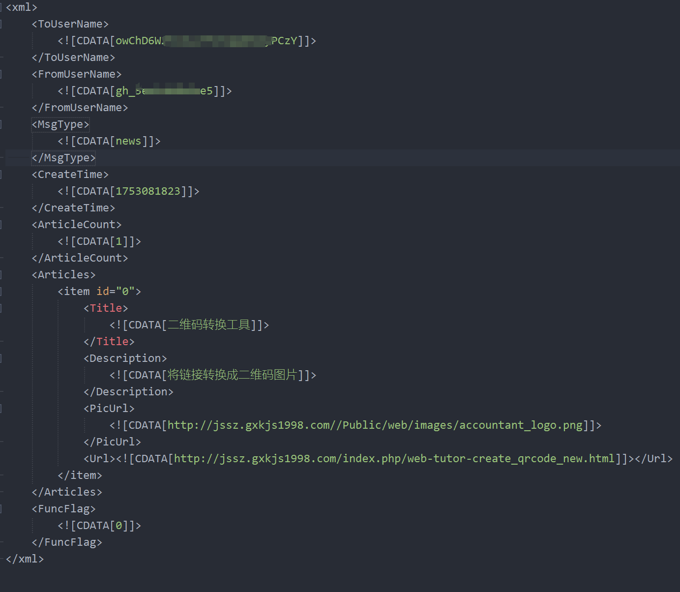 代码实现应该是没有问题的,因为这个在其他公众号上使用过,都是正常的回复。看了发送的数据貌似也没问题。只是用户没收到对应回复