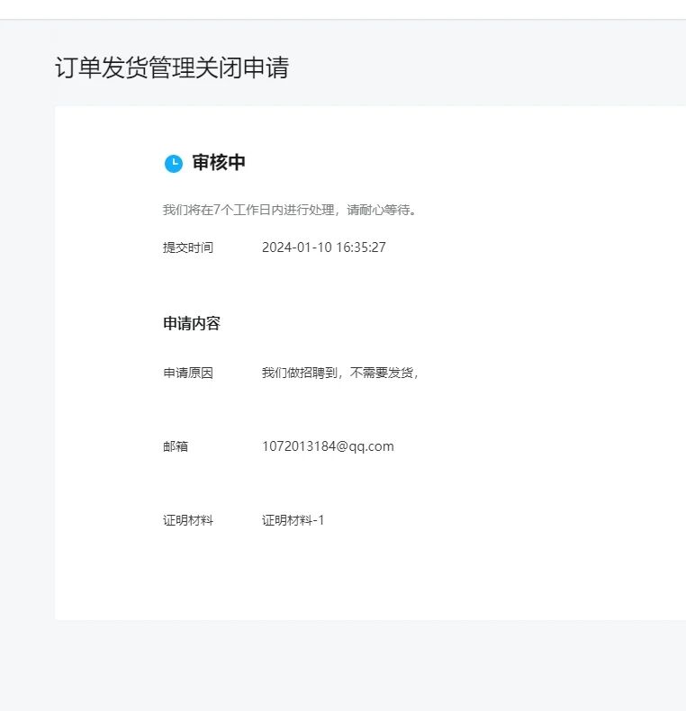 订单发货管理关闭申请2个月了,还没有审核,我们做同城信息的,根本不需要发货,还望关闭一下。