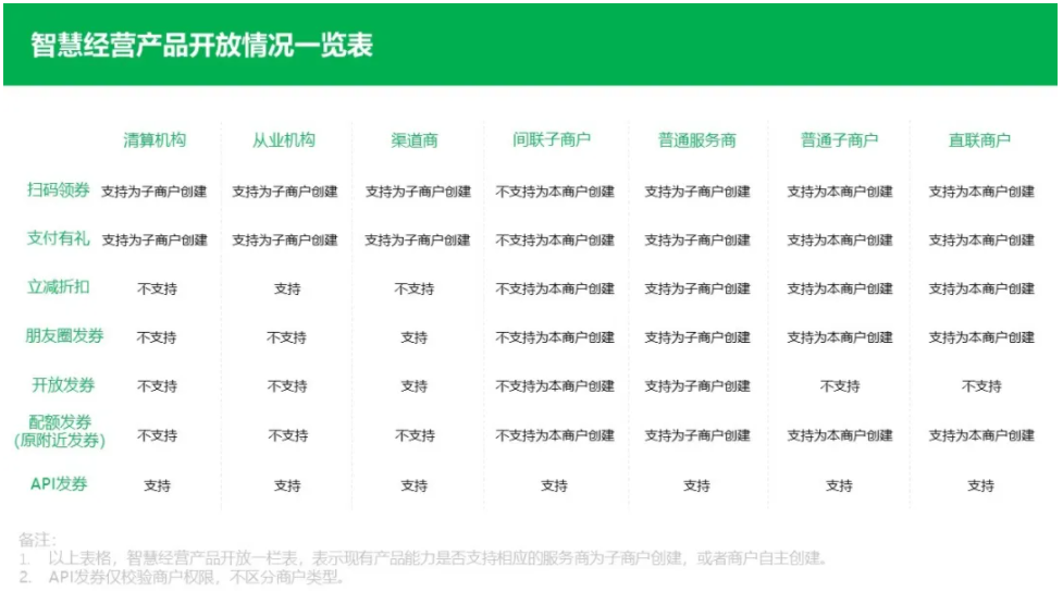 具体来说智慧经营包含以下产品:朋友圈发券/扫码领券/API发券/立减折扣/开放发券&配额发券/支付有礼等。