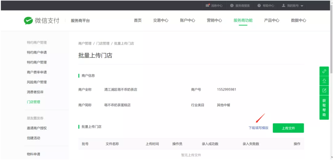 登录服务商平台→服务商功能→门店管理→下载填写模板→上传所填文件