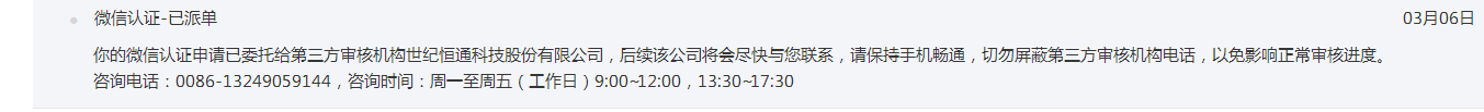 请认证联系人在审核期间留意保持电话畅通,认证过程中审核人员会与联系人沟通确认认证相关事宜。
