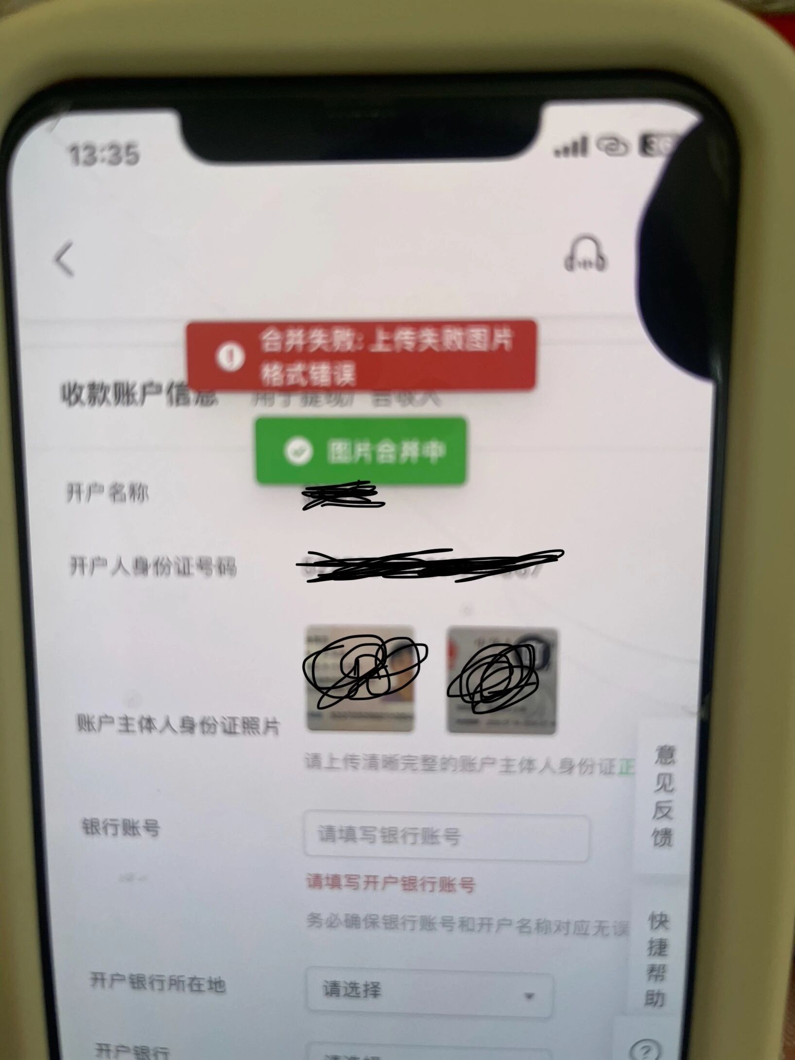 公众号提现需要完善信息,在填信息的时候叫上传身份证正反面正反面需要用的那些格式,还有照片大小不大于2M,符合要求了,为什么我上传一直说合并失败