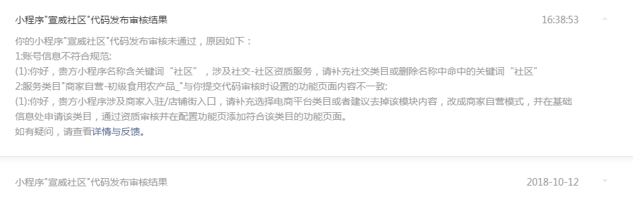 你好,经核实,贵方小程序:1.名称涉及关键词“社区”,需补充社交-社区/论坛类目或修改名称;2.贵方小程序涉及商家入驻/店铺街入口,请补充选择电商平台类目或者建议去掉该模块内容,改成商家自营模式并补充商家自营-食品类目。请修改后再提交代码审核。