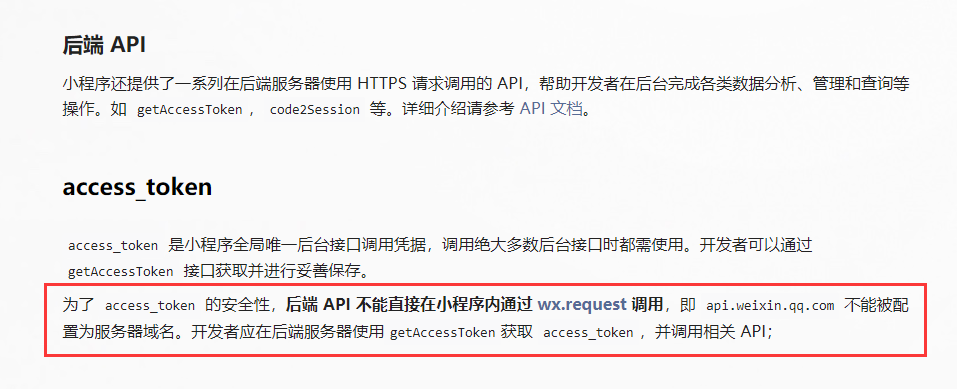 “为了 access_token 的安全性,后端 API 不能直接在小程序内通过 wx.request 调用,即 api.weixin.qq.com 不能被配置为服务器域名。开发者应在后端服务器使用getAccessToken获取 access_token,并调用相关 API;”