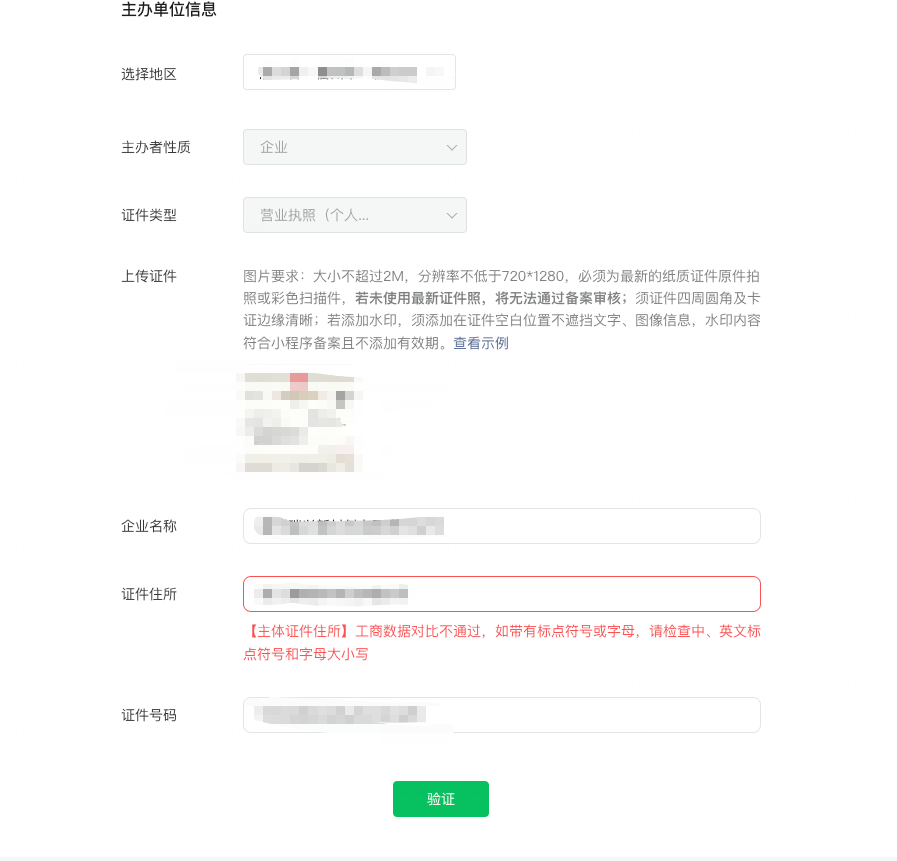 证件住所明明与工商局的数据是一样的,在小程序备案的时候,一直提示工商数据对比不通过。