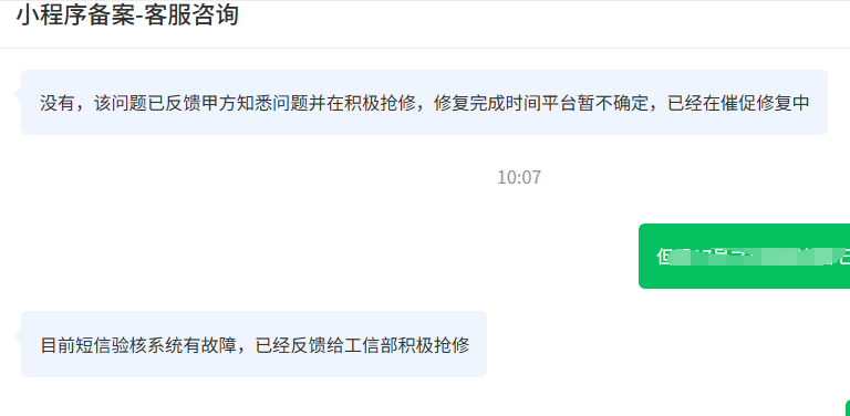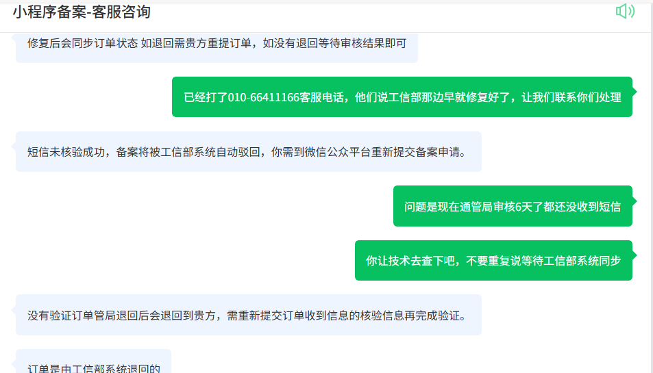 这三个小程序15号提交的备案,一直现在通管局审核中,没有收到12381 工信部发的验证码,目前等待了6天 找腾讯客服 客服一直说工信部数据同步接口有问题,等工信部修复。 我们拨打了工信部的电话,反馈说早就修复了 让联系腾讯处理。 这边又接入小程序备案客服 跟客服说明工信部数据接口同步了,但是客服依旧不查询,还是重复工信部数据同步接口有问题 这个怎么处理