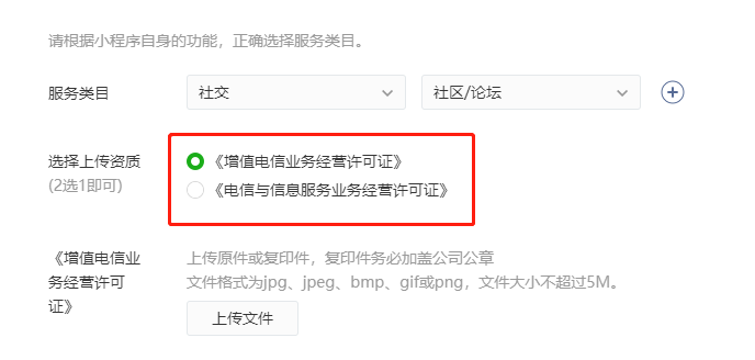 你好,社交-社区/论坛类目需要提供的资质确实为《增值电信业务经营许可证》或《电信与信息服务业务经营许可证》。《互联网信息服务管理办法》规定,经营性互联网信息服务,是指通过互联网向上网用户有偿提供信息或者网页制作等服务活动。从事经营性互联网信息服务,应当向省、自治区、直辖市电信管理机构或者国务院信息产业主管部门申请办理互联网信息服务增值电信业务经营许可证(即ICP证)。通过小程序提供信息服务,也属于通过互联网向上网用户有偿提供信息服务活动,因此需要ICP证。
