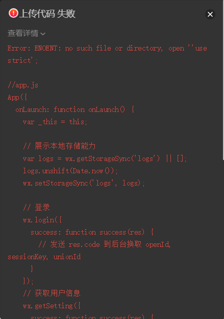 使用开发者工具进行上传时候遇到的问题,应该是文件或目录不存在的问题,但是报错信息显示的不是一个路径而是一整段代码,有没有大神知道这是怎么回事?