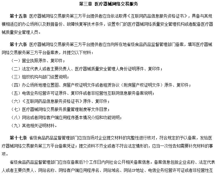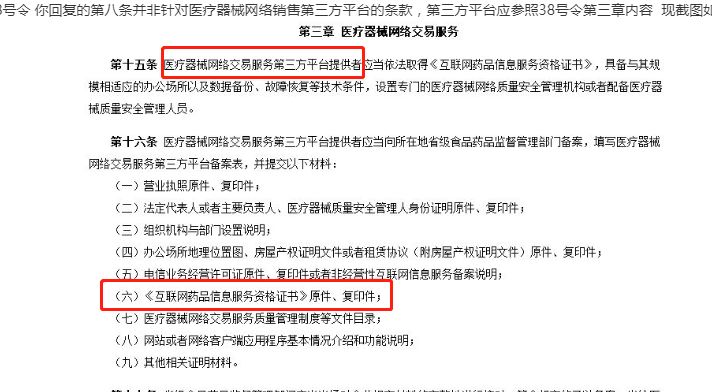 审核老师您好!根据总局第38号令 你回复的第八条并非针对医疗器械网络销售第三方平台的条款,第三方平台应参照38号令第三章内容 现截图如下:且我公司已取得相应的备案证书,请审核老师再次审核!