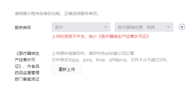 根据《医疗器械网络销售监督管理办法》第八条,从事医疗器械网络销售的企业,应当填写医疗器械网络销售信息表,将企业名称、法定代表人或者主要负责人、网站名称、网络客户端应用程序名、网站域名、网站IP地址、电信业务经营许可证或者非经营性互联网信息服务备案编号、医疗器械生产经营许可证件或者备案凭证编号等信息事先向所在地设区的市级食品药品监督管理部门备案。相关信息发生变化的,应当及时变更备案。《医疗器械经营许可证》是证明主体可以合法经营医疗器械;《备案》是针对网络销售要求进行的备案凭证,因此,小程序医疗器械经营、销售类目需要同时提供《医疗器械经营许可证》和市食品药品监督管理部门备案凭证