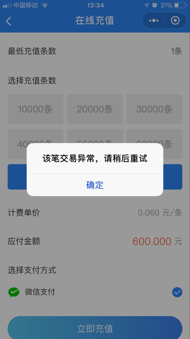 微信支付调用该接口偶尔会碰到用户输入密码后,出现:“该笔交易异常,请稍后重试”的提示(如图),后微信服务商后台查看订单交易失败;