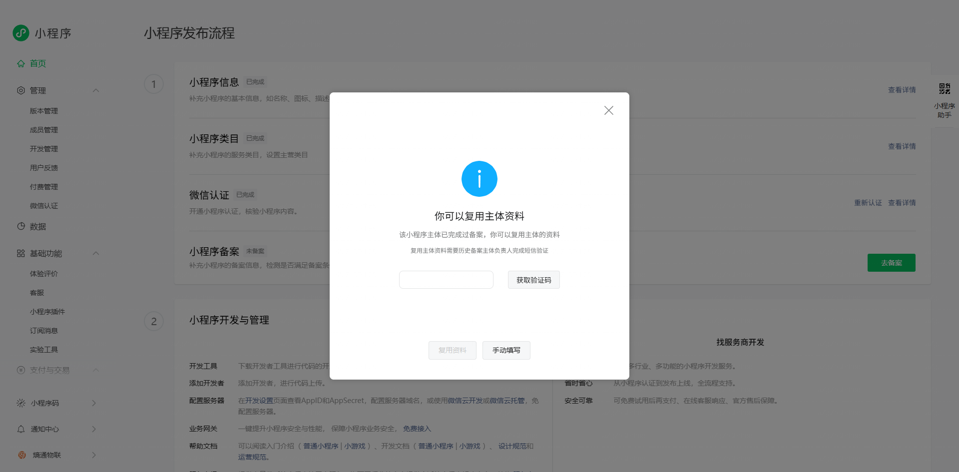但是问小程序当前主体负责人谁备案的,都不知道是谁,获取不到验证码。无法复用,只能手动填写