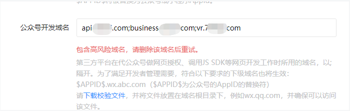 域名已经备案通过了,但是设置公众号开发域名的时候会提示:包含高风险域名,请删除该域名后重试。