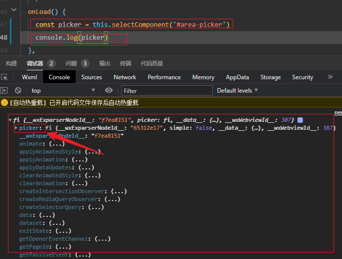 onLoad() { const picker = this.selectComponent('#area-picker') console.log(picker) } 打印结果如下:点开 fi 对象,里面有个 picker 对象,这才是 picker 实例,picker 实例里的 __proto__ 原型里就有这些方法