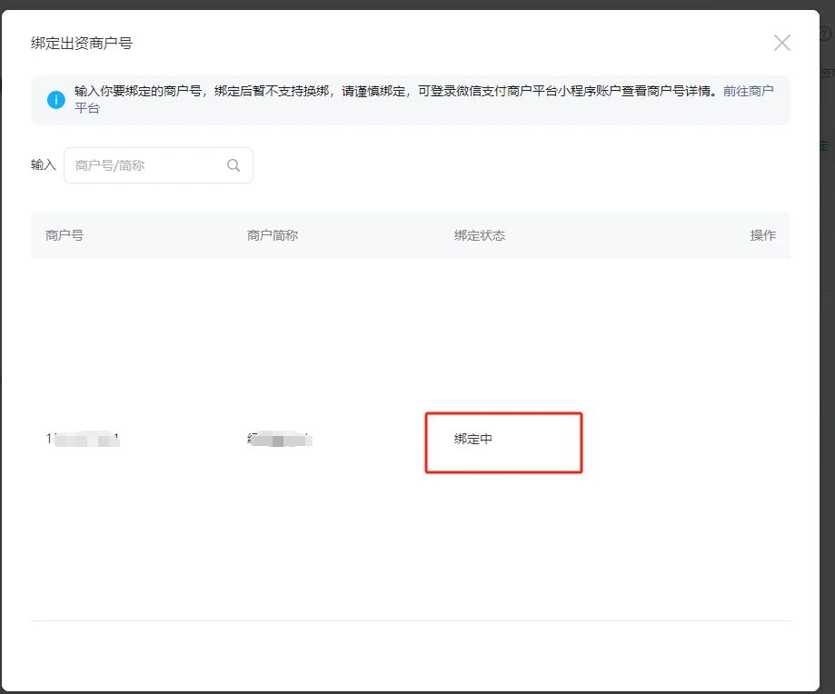 1、绑定出资商户号提示绑定中扫码确认开通功能
