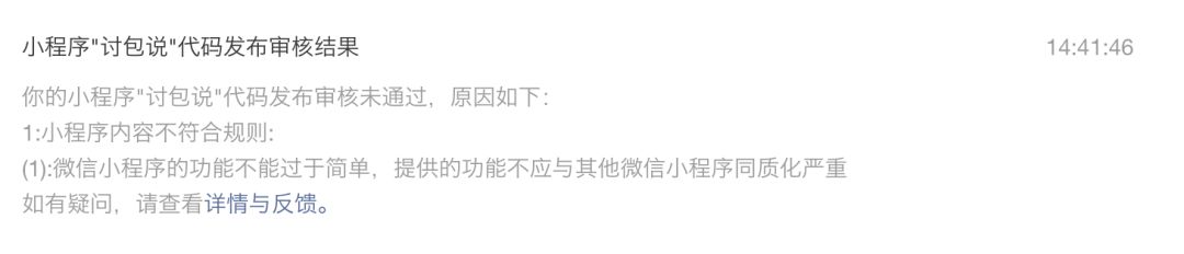 修改了一次不通过的原因依然如此,希望可以给一个明确的未通过的原因,或者告知一下“你别改了,再改也不会过的明示”,在讨论区问了好多次了,别人都能给解答,我们的一条回复也没有,希望小程序官方能够尊重一下生命行么?