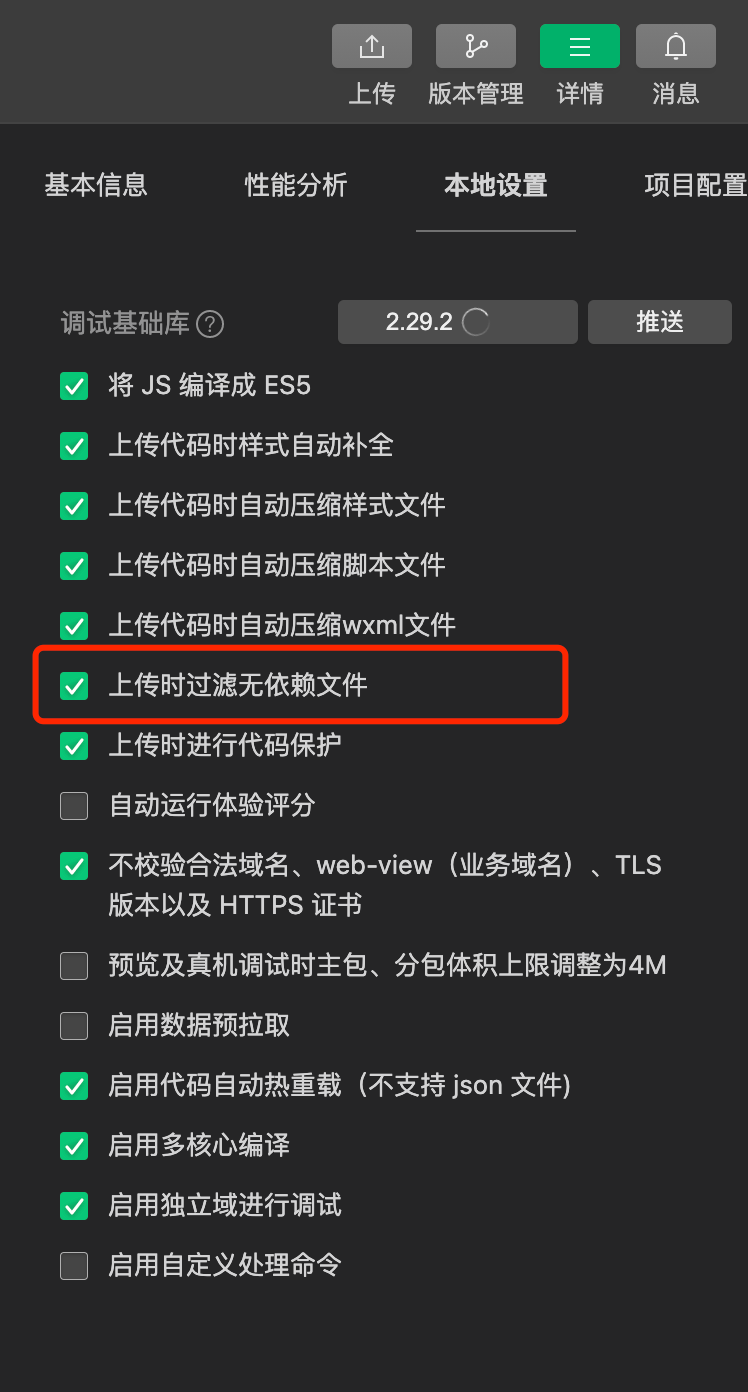 // app.json "lazyCodeLoading": "requiredComponents"勾选 上传时过滤无依赖文件
