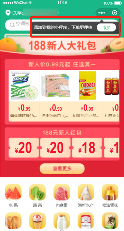 通过优惠券/积分等奖励,诱导添加至我的小程序。