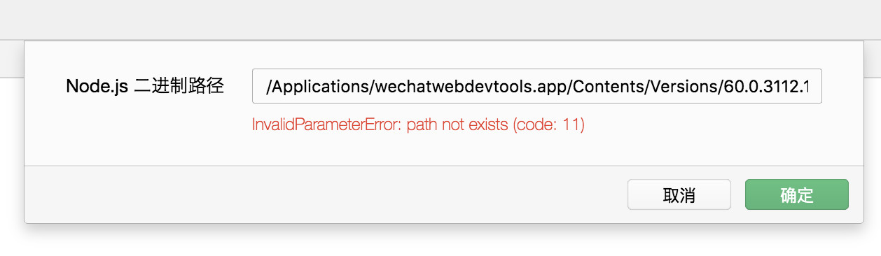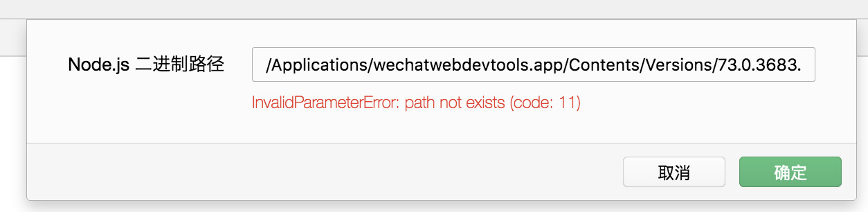 目前只有/Applications/wechatwebdevtools.app/Contents/Versions/73.0.3683.103/wechatwebdevtools\ Helper.app/Contents/MacOS/node 此路径在终端能运行,但在开发工具中显示路径不存在