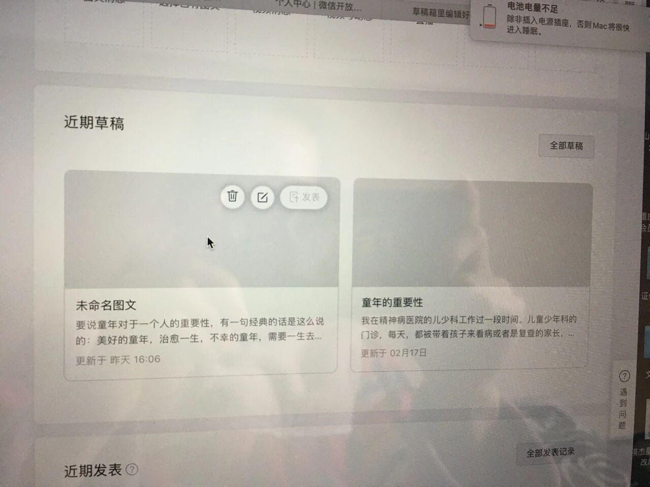 这是最新草稿和最早原始草稿,这几天每天修改,每天保存,都显示成功了,但是昨天下午操作保存不成功,不见了,再次打开草稿箱,就只有这两个,而且说明这几天所有的保存都无效,否则我随便拿一个这几天修改后的草稿都能将文章基本还原。