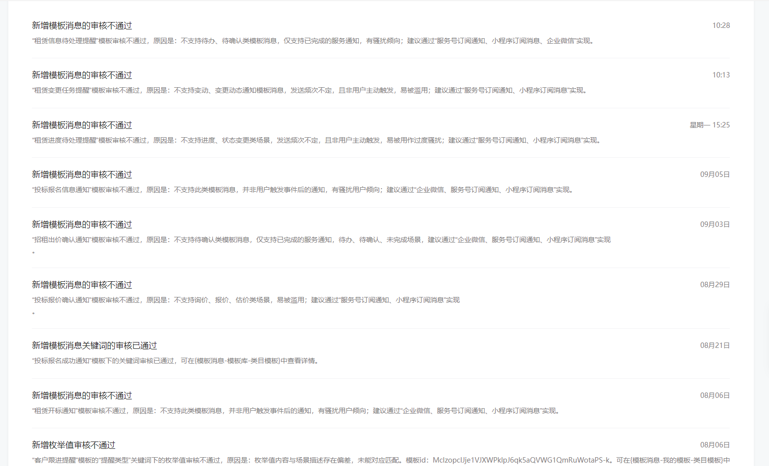 2、模板消息仅作为一种反馈相关服务结果的最终凭证依据,不等同短信用途;标题【租赁变更任务提醒、租赁信息待处理提醒】任务类、待办提醒类场景,不适用于模板消息。建议通过以下方式实现,