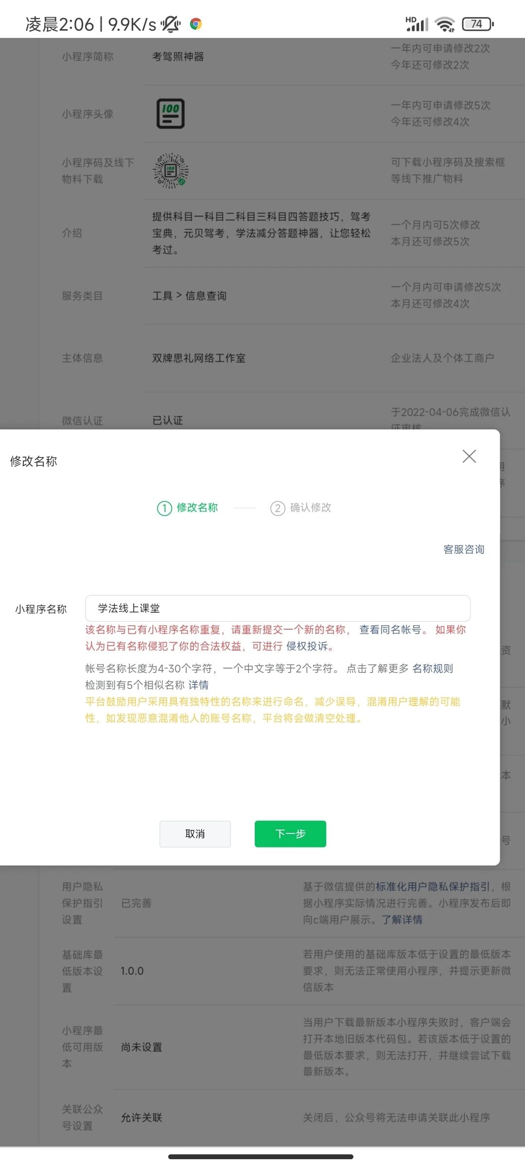 为什么我小程序和公众号同一个主体,我想把小程序名称改为和公众号一样的名称,也显示侵权无法确认呢