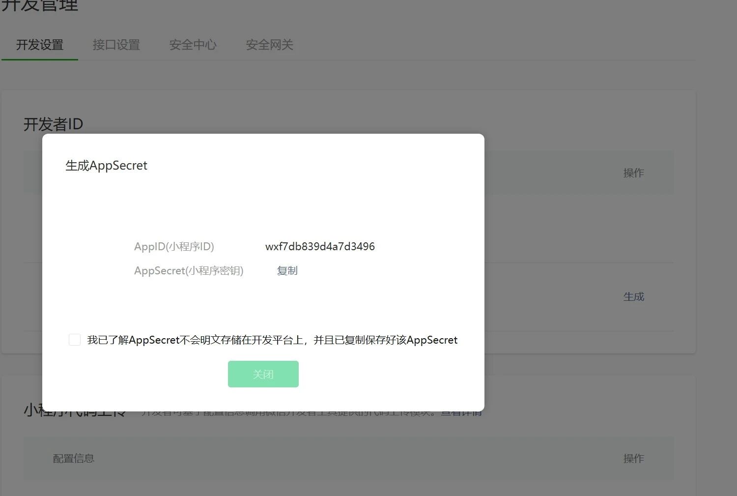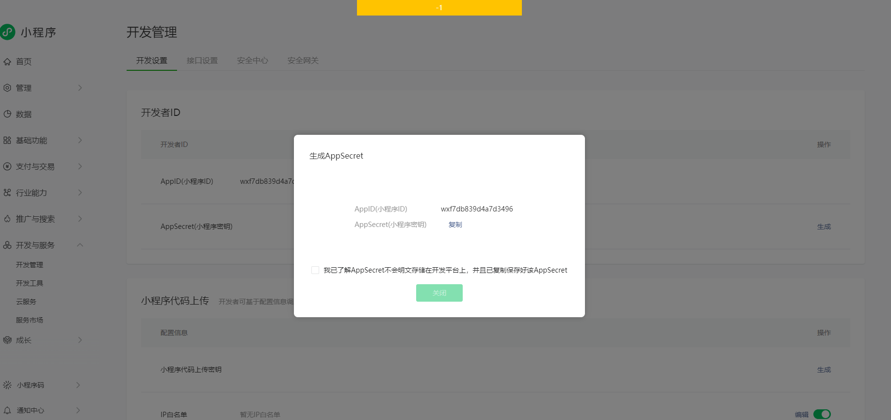 这个问题出现好几天了,一直没办法生成密钥,点击生成,系统显示已生成,但是没有任何密钥代码,同时顶部显示-1,其他小程序都正常,但是就这个一直无法显示。请求解决!