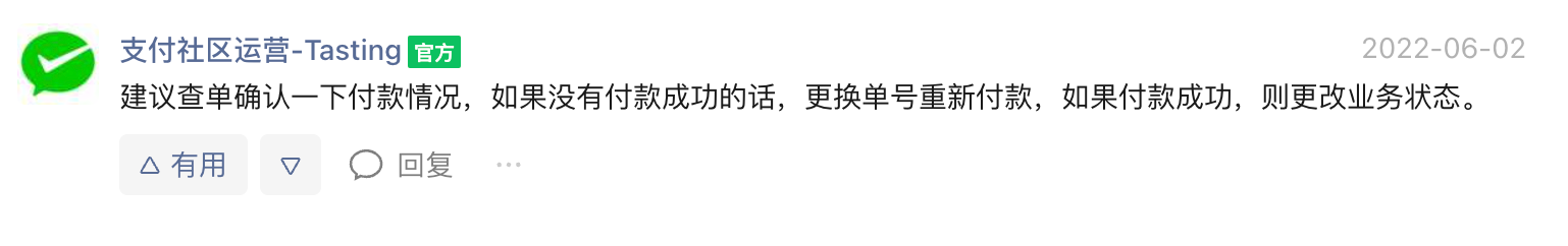 现在出现这种情况,重试是过不去的,要企业用户去改订单号,这不符合安全性完整性要求啊!