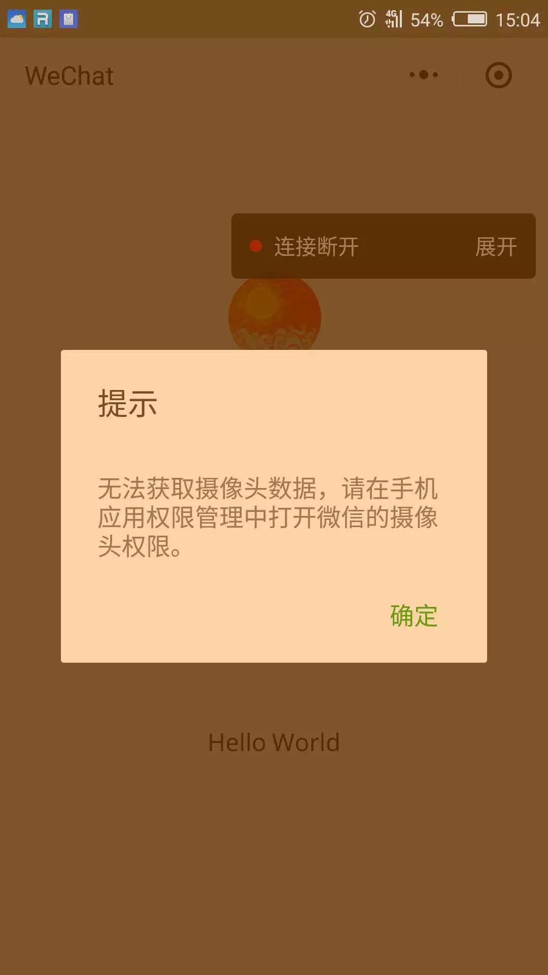 写完代码后点击Remote debug ,然后用手机扫描二维码,这时候在手机上可以看到我的小程序启动了。但是,接下来就弹出 “无法获取摄像头数据,请在手机应用权限管理中打开微信的摄像头权限”