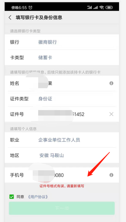微信绑定银行卡提示 证件号格式有误,怎么办? 用了没升位前的身份证号码填写可以通过,不提示证件号格式有误了。 但又与银行余留号码不一致!