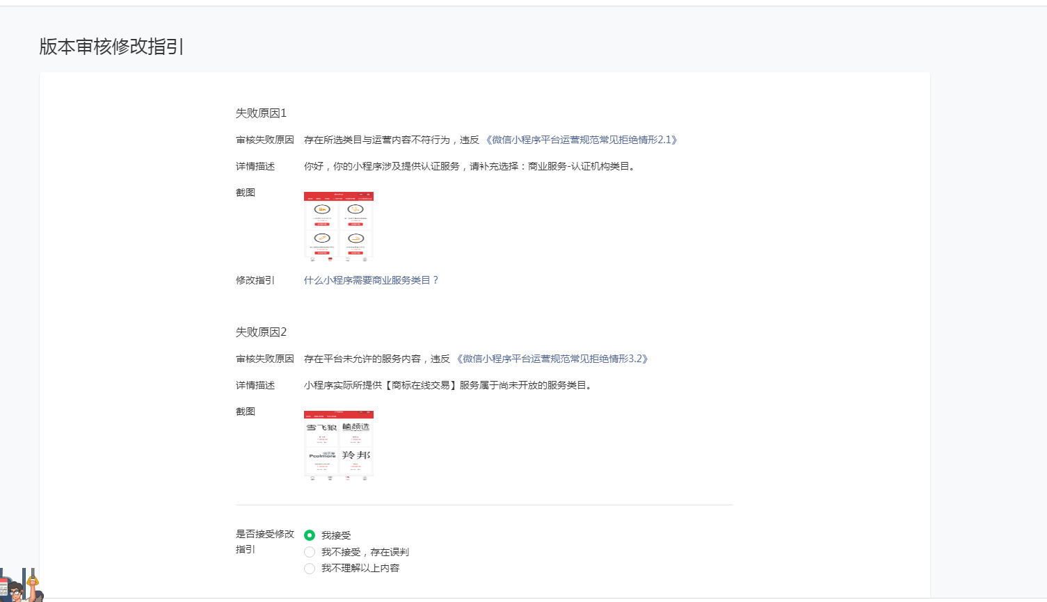 此外小程序涉及提供商标在线交易等服务,属于平台尚未开放的服务类目,需整体移除违规内容后再重新提交版本审核。