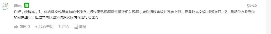 (1):你好,个人主体小程序暂不支持使用文娱-视频插件,请修改后再提交审核。