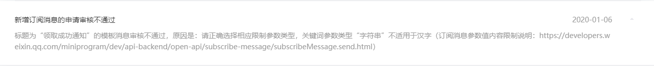 2)订阅消息模板对标题、关键词及关键词参数类型都有严格要求,关键词内容示例必须与关键词对应匹配,且要求匹配对应的限制参数类型;关键词参数类型“字符串”不适用于汉字,请正确选择填写(订阅消息参数值内容限制说明:https://developers.weixin.qq.com/miniprogram/dev/api-backend/open-api/subscribe-message/subscribeMessage.send.html