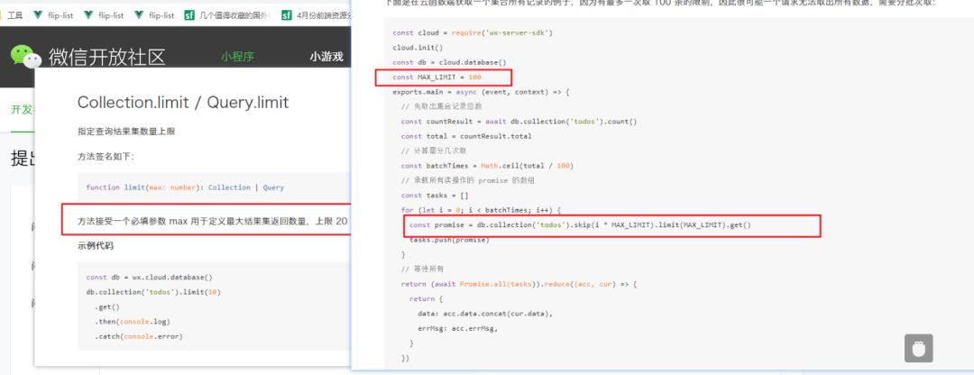 云开发提供了两套api,你在小程序里用limit,那么就是20,你在云函数里用limit(要先上传到云,在云中执行),那么就是100。