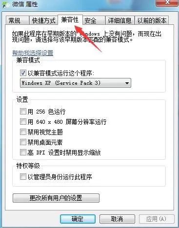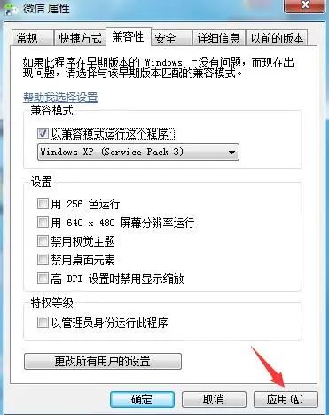 出现这种问题一般是64位系统,以WIN7 64位系统为例,右键单击微信图标,点属性,按以下步骤操作,兼容性——以兼容模式运行这个程序,最后单击应用即可
