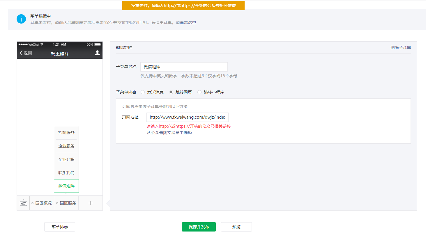 老师您好,新增公众号菜单时无法保存连接: 提示:请输入http://或https://开头的公众号相关链接