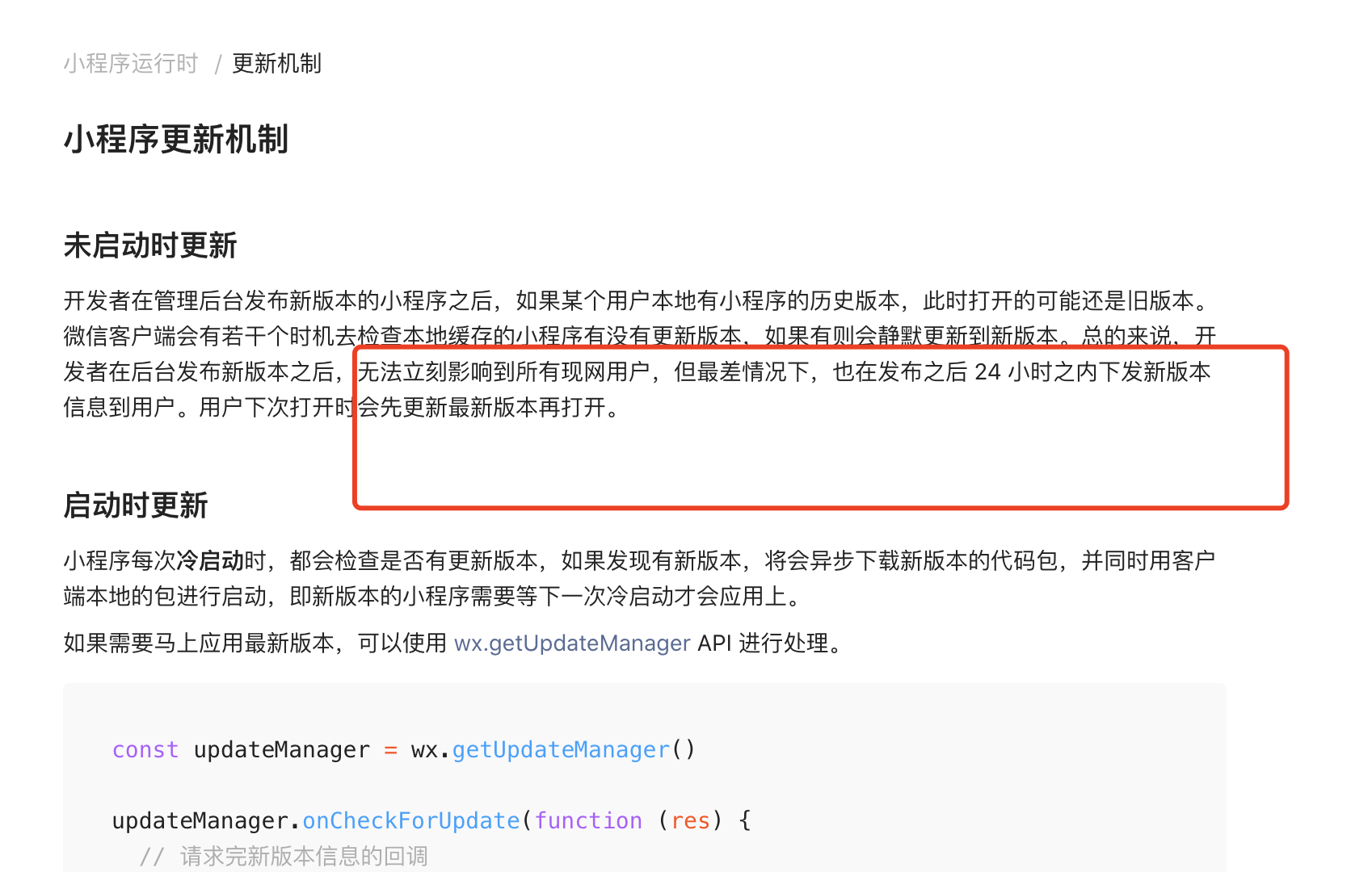 // 版本更新管理器 if (Taro.canIUse('getUpdateManager')) { const updateManager = Taro.getUpdateManager() updateManager.onCheckForUpdate(function (res) { if (res.hasUpdate) { updateManager.onUpdateReady(function () { Taro.showModal({ title: '更新提示', content: '新版本已经准备好,是否重启应用?', success: function (res) { if (res.confirm) { updateManager.applyUpdate() } } }) }) updateManager.onUpdateFailed(function () { Taro.showModal({ title: '已经有新版本了哟~', content: '新版本已经上线啦~,请您删除当前小程序,重新搜索打开哟~' }) }) } }) } else { Taro.showModal({ title: '提示', content: '当前微信版本过低,无法使用该功能,请升级到最新微信版本后重试。' }) }那些什么updateManager 这种东西,早就弄好了的。