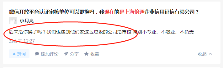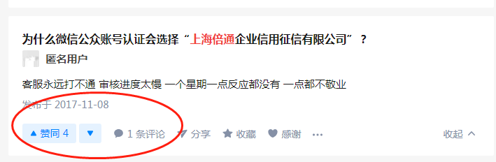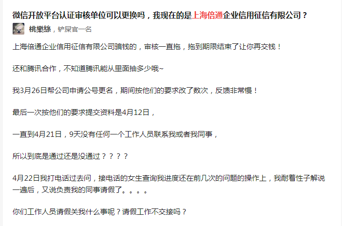 期间我们先后4次联系该公司总机,要求后续审核跟进,或更换审核专员,但是半个月来从未得到任何回复,后来到百度上一搜,才发现,很多企业都遭遇类似的情况,大家都在吐槽他们公司,拖拖拉拉,不及时审核,不及时跟进电话,最后再收一次300元认证费!这种扭曲的价值观,是不会被社会任何和接受的!