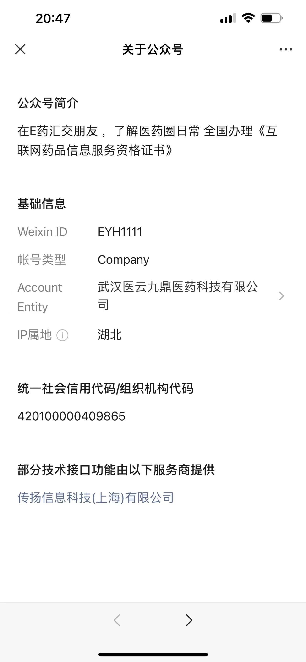 我想举报一个叫“E药汇”的公号,微信id为:EYH1111,认证主体为武汉医云九鼎医药科技有限公司,ip属地为湖北。如下图