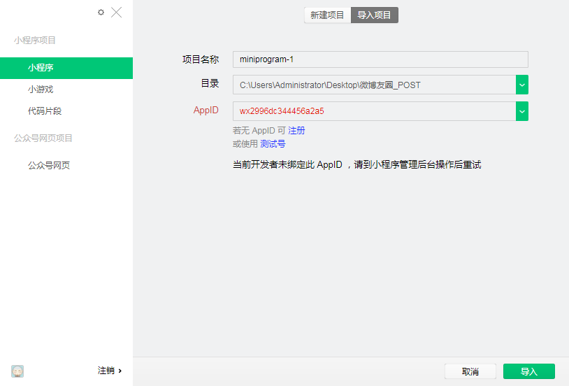 我也存在这个问题,appid是我自己的,但是导入项目就是不行,后台也是有绑定appid的