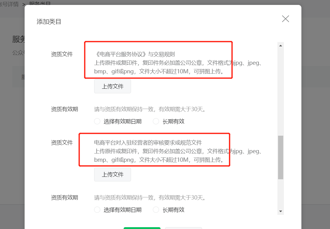 微信公众号类目的 电商平台服务协议和电商平台对入驻经营者的审核要求或规范文件怎么填写?