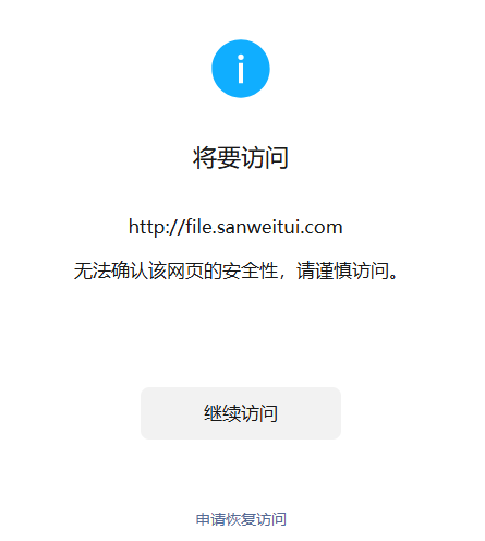 file.sanweitui.com,微信内访问网站出现“无法确认该网页的安全性,请谨慎访问”的拦截提示,网站符合《微信外部链接内容管理规范》,腾讯安全网址安全中心检测网页没有不安全的内容,请求核实后解除在微信内的访问拦截提示,谢谢!