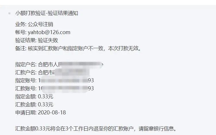 微信公众号服务号无法注销 在打款之后 验证结果为:核实到汇款账户和指定账户不一致,本次打款无效。