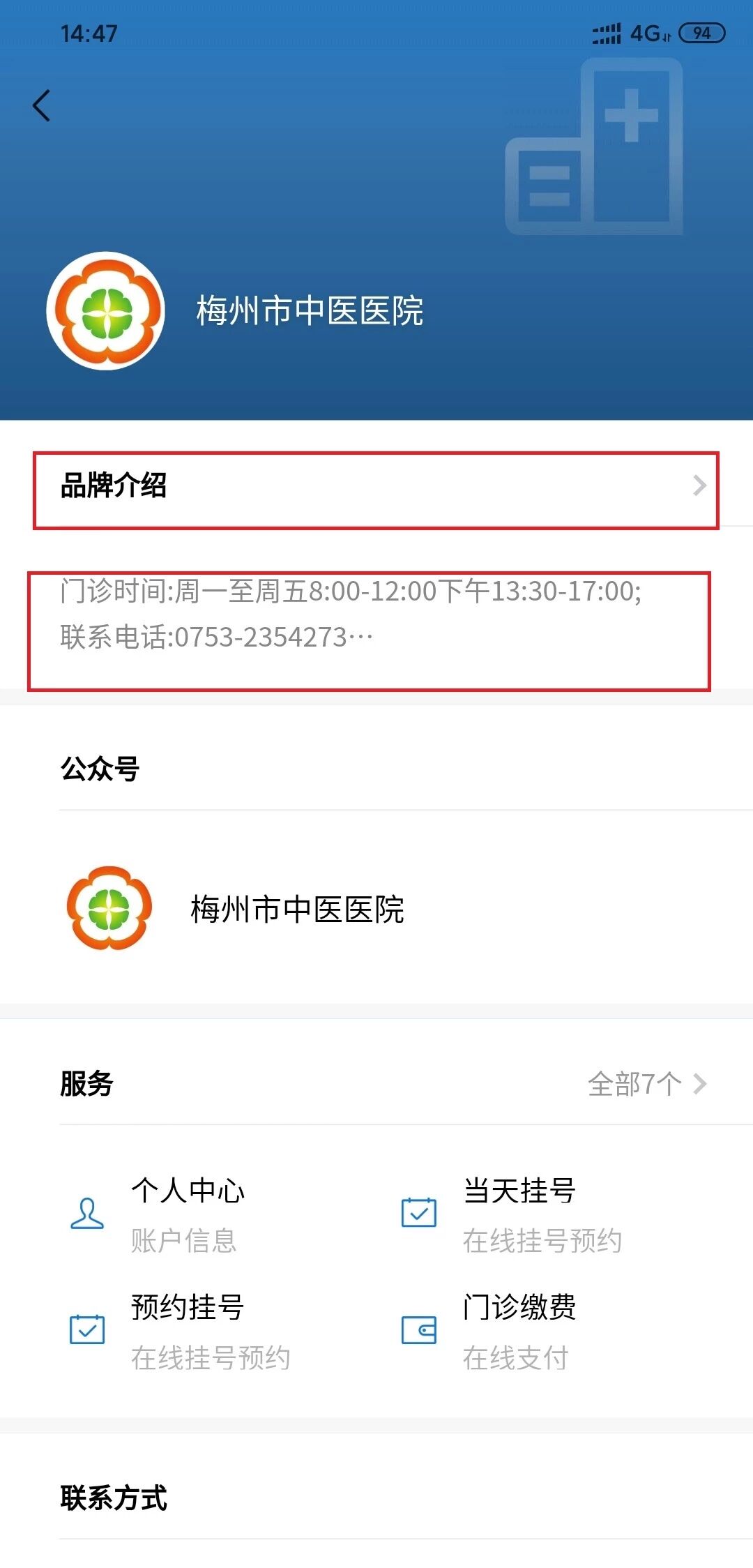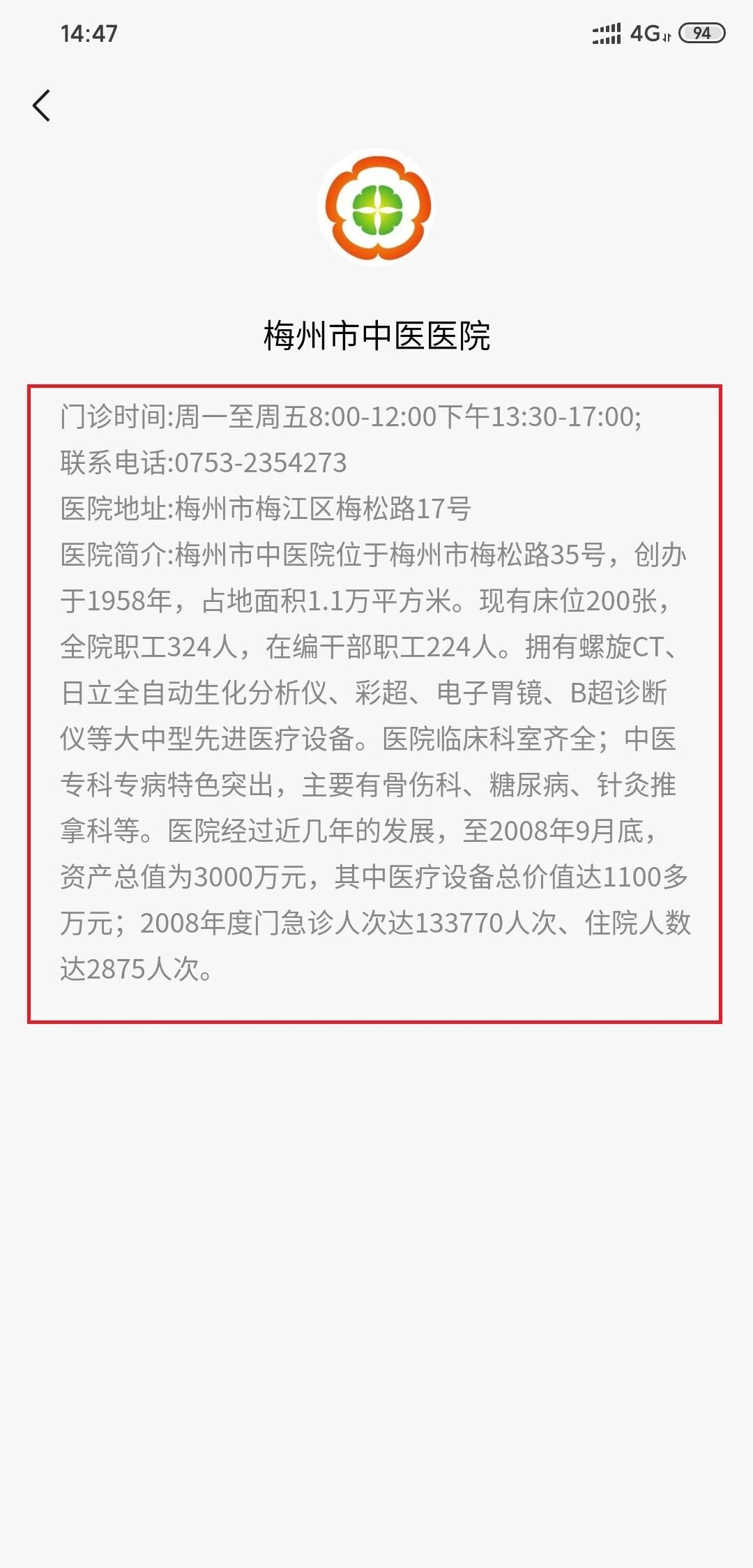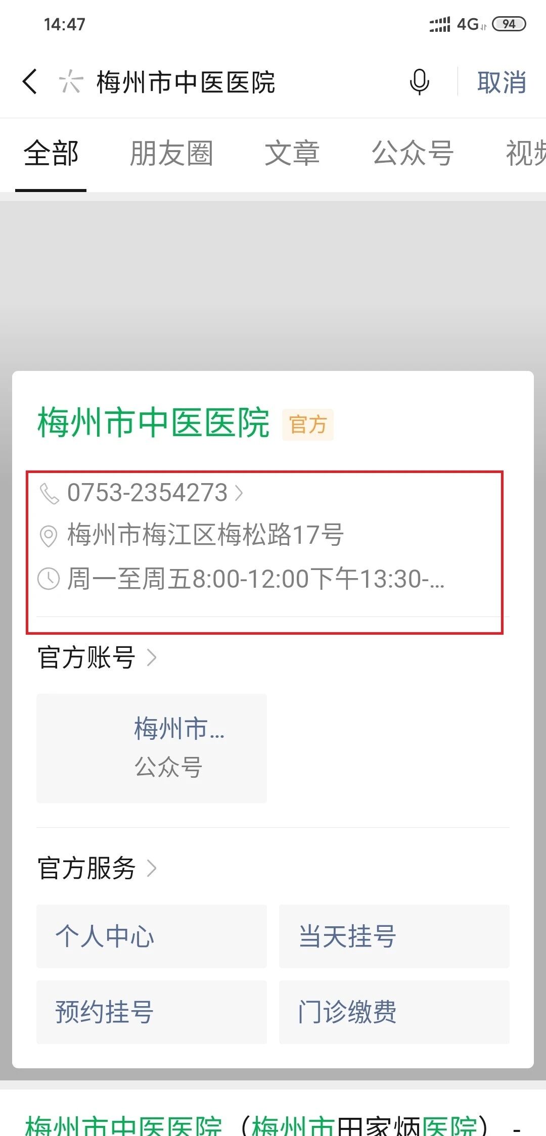 微信搜一搜小程序中搜出来关于广东省梅州市中医医院的简介内容有误,搜索出来的简介内容是其他医院的基本信息,如下三张图所示,除了医院的院徽与医院名称是正确的,其余有红色方框标记的内容均是错误的,是另一家医院的信息,如此搜索出来的内容会误导公众。