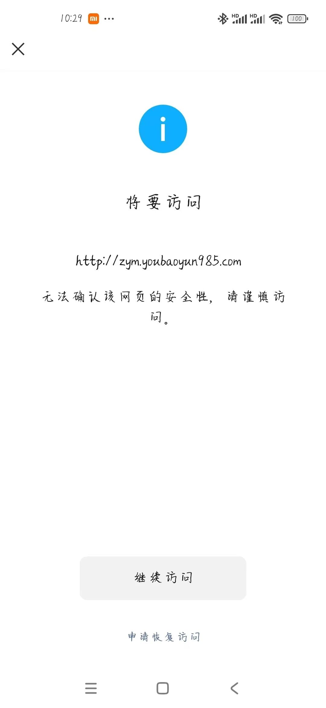 您好,域名youbaoyun985.com在西部数码注册并通过优刻得备案通过,http://zym.youbaoyun985.com/浏览器访问正常,我是网站开发者,访问时间如图2025/11/25,点开网址提示“无法确认该网页的安全性,请谨慎访问。”经检查网页里没有不安全的内容,请核实后帮忙解除拦截,谢谢!尽快处理,急急急,现在需要打开使用,谢谢啦!