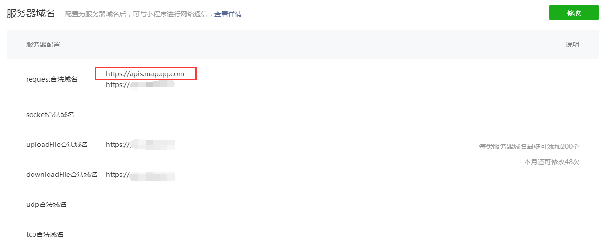 2、其次,我微信小程序服务器域名没有添加腾讯地图的接口域名,需要在request合法域名里添加https://apis.map.qq.com,如下图:
