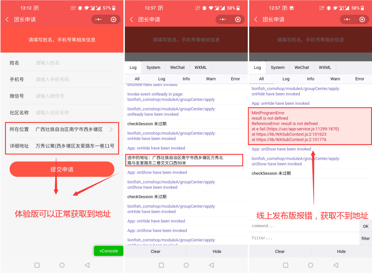1、如上图所描述,在微信开发者工具和体验版本上,都可以正确获取到地址,唯独发布上线版本选择不了地址,报错信息如下: